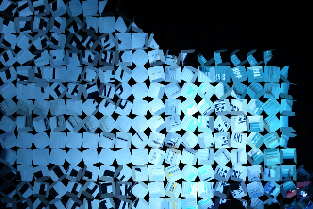 Ein Bild von mit blauem Licht angestrahlten Schiffscontainern habe ich hier zunächst in Quadrate fester Größe zerlegt. Jedes Quadrat wird dann mit einen 3D Effekt erweitert. Die Füllfarbe des 3D Effekts ergibt sich aus Durchschnittswerten des ursprünglichen Quadrats. Dann wird jedes der neuen Elemente um einen zufälligen Wert gedreht, wobei die durch die Drehung entstehenden Leerstellen schwarz bleiben. Die Container sehen nun aus, als würden sie aus Bauklötzen bestehen, die gerade zusammenfallen.