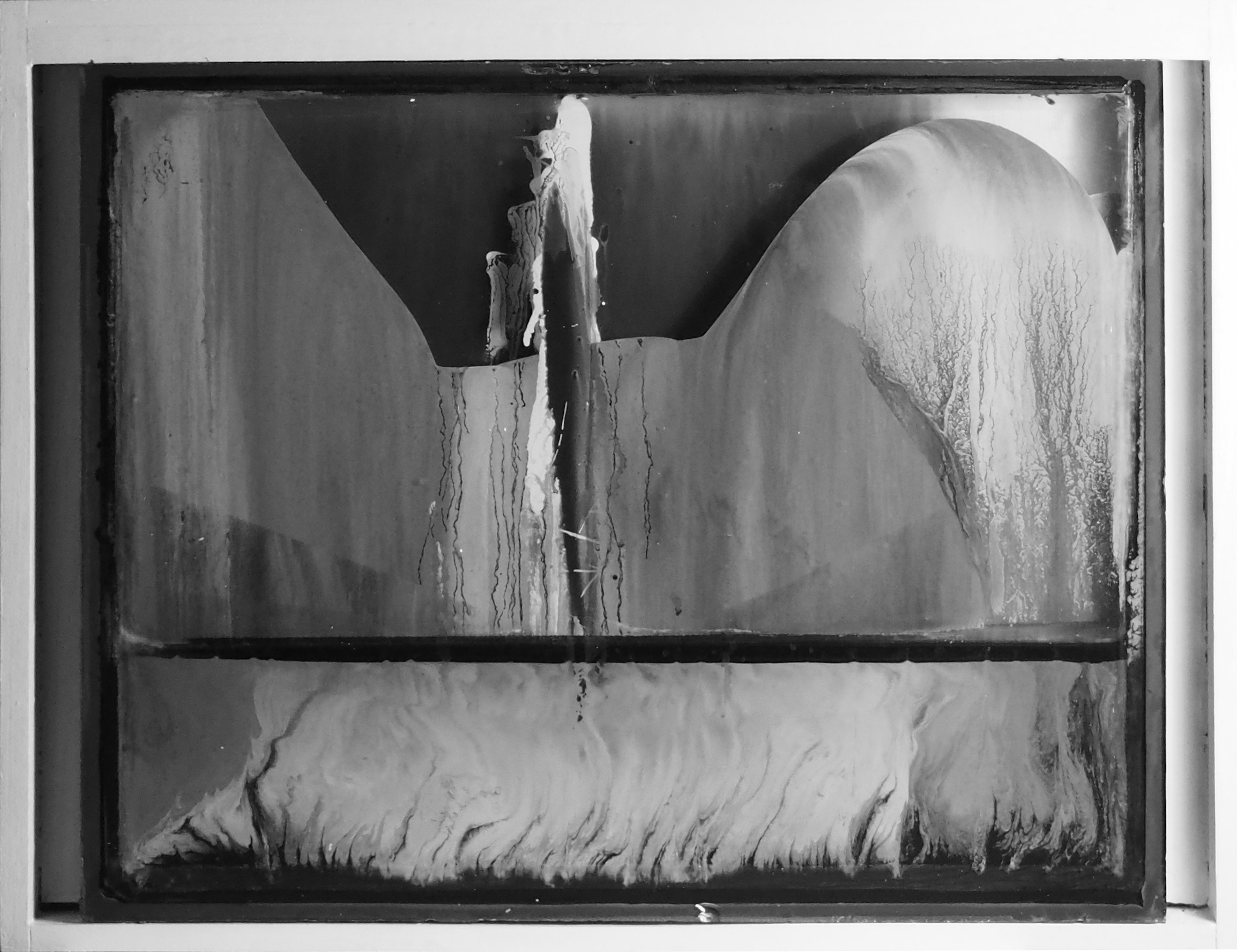 Für dieses Bild habe ich ein Doppelglas-Element aus einem Sprossenfenster oben aufgebohrt und nach und nach sehr flüssige weiße und schwarze Farbe eingefüllt. Das Objekt wurde immer wieder geschüttelt und stehen gelassen, wodurch die Farbe an den Glaswänden auf sehr ästhetische Weise getrocknet ist. Ein Teil der Farbe im Inneren ist noch flüssig. Damit verändert sich das Bild im Laufe der Zeit noch ein wenig. Für das Bild habe ich einen weißen Rahmen gefertigt, der oben und unten genau passt, am Rand aber einen Spalt freilässt.