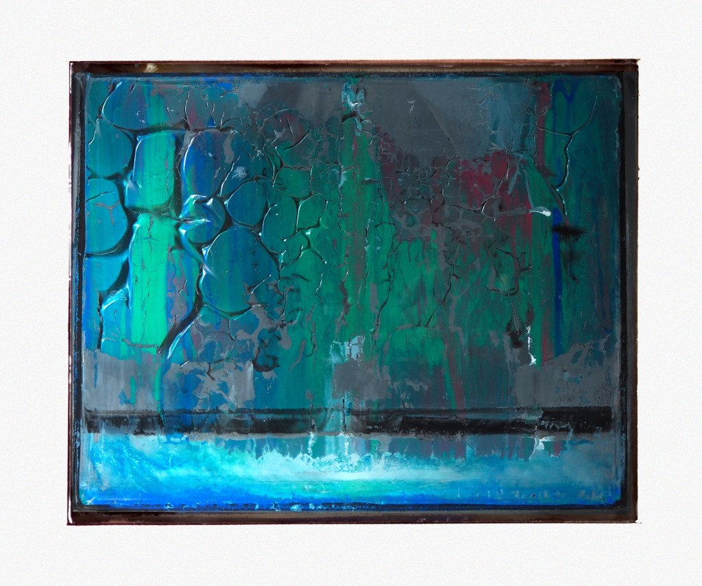 Mein drittes Bild der Serie „Flüssigglas“. Zur Technik siehe hier. Im Gegensatz zu den beiden anderen Bildern der Serie habe ich hier mit Acrylfarben in den Grundtönen grün, blau und rot gearbeitet. Zusätzlich wurde noch ein Pouring-Mittel verwendet. Das Bild ist in einem längeren Prozess entstanden, bei dem die Flüssigkeit immer wieder reduziert wurde und weitere Farbe hinzugefügt wurde. Der obere Bildbereich, in dem grün und blau dominieren, ist links sehr plastisch, rechts flacher und mit roten Tönen ins Dunklere abgleitend. Im flüssigen Bereich unten entstanden schöne Meeres-Töne und Strukturen.