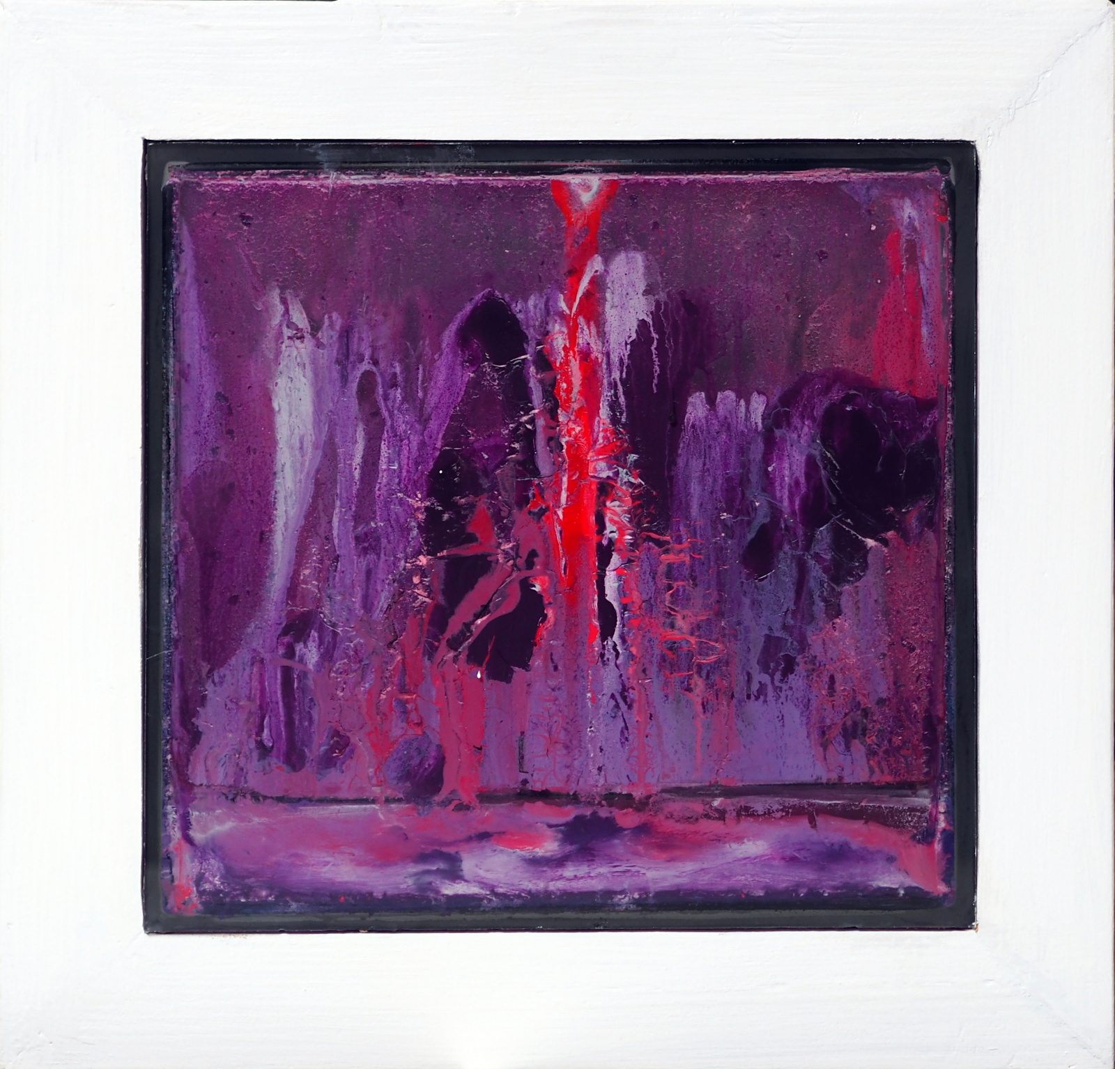 Mein viertes Bild der Serie „Flüssigglas“. Zur Technik siehe hier. Im Gegensatz zu den beiden ersten Bildern der Serie habe ich hier mit Acrylfarben in den Grundtönen weiß, blau und rot gearbeitet. Zusätzlich wurde noch ein Pouring-Mittel verwendet. Das Bild ist in einem längeren Prozess entstanden, bei dem die Flüssigkeit immer wieder reduziert wurde und weitere Farbe hinzugefügt wurde. In diesem Bild ist die „Wasserlinie“ nicht so bestimmend und im Bereich darüber sind vielfältige Formen sichtbar. Im Mittelpunkt steht eine rote „Fontäne“. Interessanterweise ist bei diesem Bild die Rückseite genauso schön wie die Vorderseite geraten, weshalb ich sie als gleichwertig erachte. Dieses Bild sind also zwei Bilder.