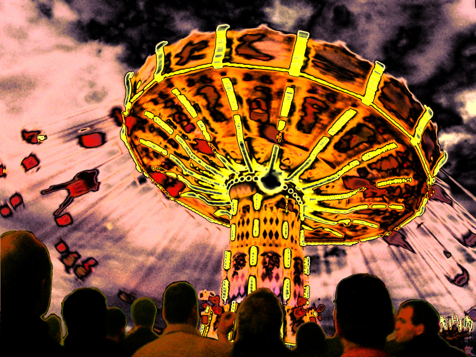 Ein Kettenkarussell auf der Frankfurter Dippemess. Das Bild ist mit einem Plasma Filter stark verändert und aus einem anderen Bild wurde eine Reihe von Konzert-Zuschauern hinein montiert.