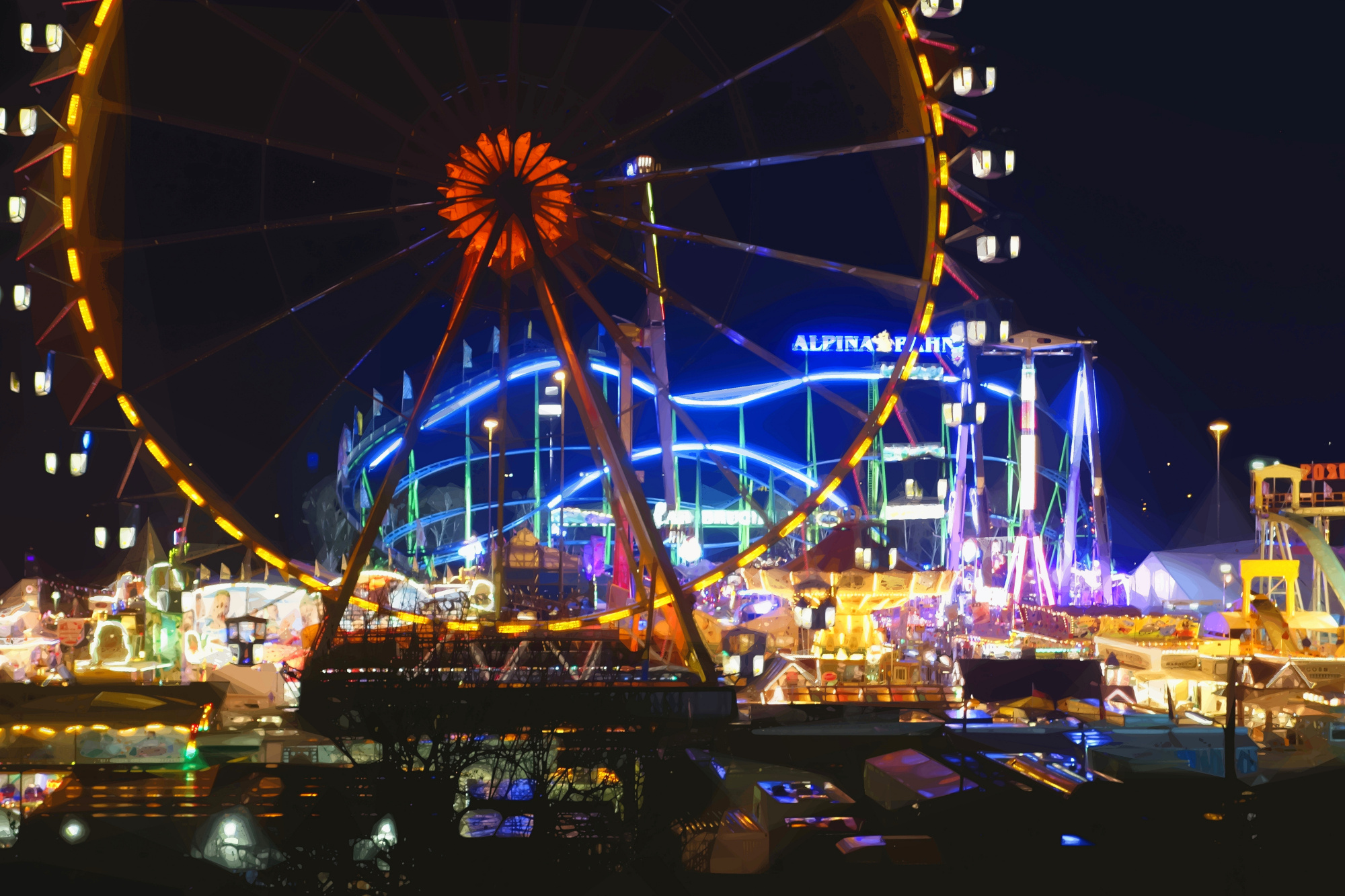 2015 habe ich die Dippemess, das Frankfurter Volksfest, vom Bornheimer Hang aus mit einem leichten Tele in der Nacht fotografiert. Dieses Bild zeigt im Wesentlichen die Achterbahn und das Riesenrad, aber auch die ganzen Lichtwelt dazwischen. Die Belichtung war mit 1/15 Sekunde nicht zu lang, so dass im Wesentlichen alle Details scharf waren. Das Bild habe ich dann mit einem eigenen Filter bearbeitet, der auf zufällige Weise Bereiche ähnlicher Farbe zusammenfasst und glättet.
