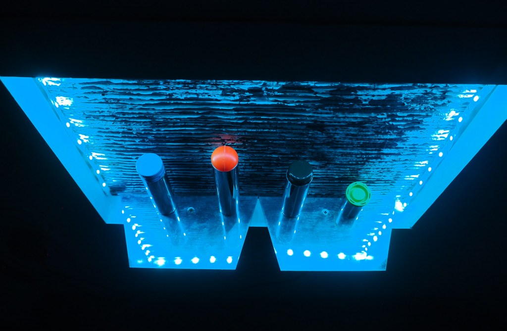 Diese Skulptur habe ich wieder einmal aus Reststücken hergestellt, die sonst weg geworfen worden wären. Abschnitte von Abflussrohren, die man im Baumarkt nur in einer Standard-Länge bekommt, Flaschenverschlüsse, zwei spiegelnde trapezförmige Bleche aus einem alten Projektor, ein Stück Wellpappe. In die Innenseite des selbst gebauten Rahmens habe ich ein Stück LED-Band geklebt, welches ich für einen anderen Zweck gekauft, aber dann doch nicht verwendet habe. Die Skulptur erscheint durch die verschiedenen (einstellbaren) Lichteffekte und die Spiegelungen wie ein Detail aus einer Diskothek. Die Idee dahinter ist aber, den Zirkus der allgegenwärtigen Meinungsumfragen zu beleuchten. Ständig werden wir damit konfrontiert und sollen auch selbst abstimmen. In diesem Fall liegt orange Kugel knapp vor blauem und orangem Zylinder und klar vor grüner Scheibe.