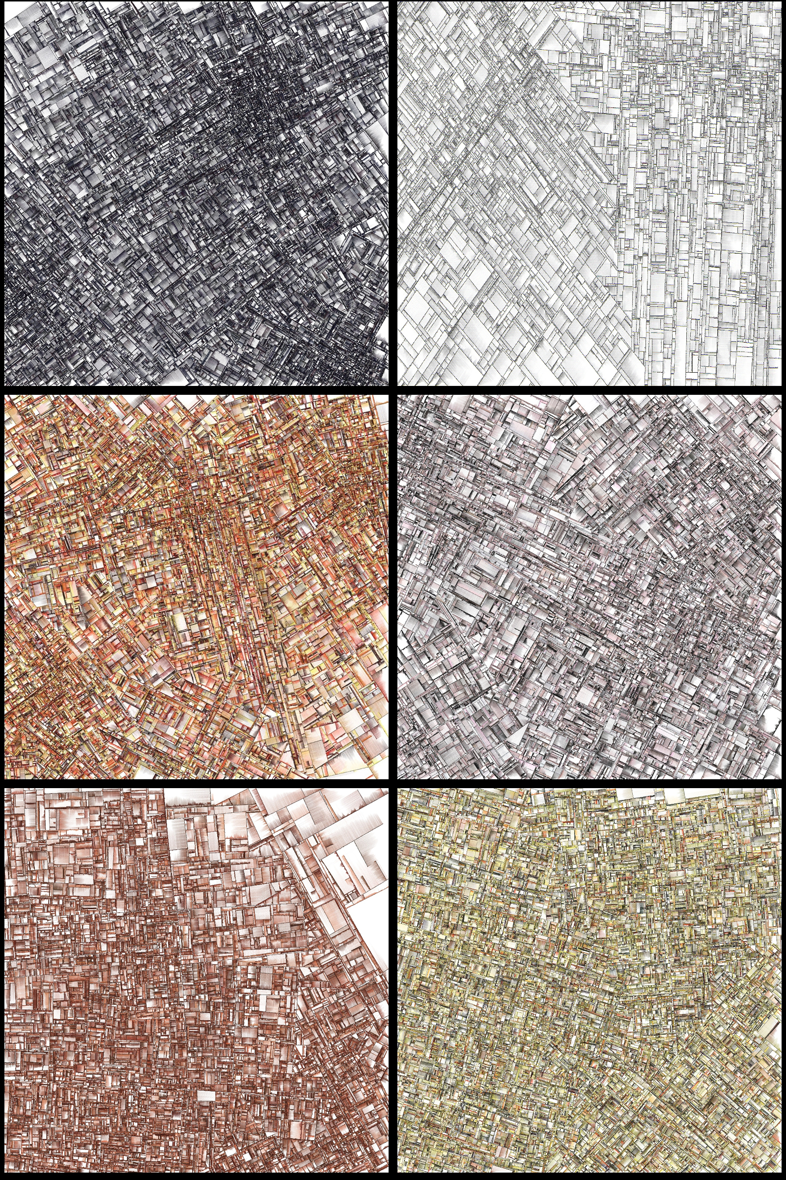 Sechs Ausgaben eines Algorithmus, der Grafiken erzeugt, die Wegenetzen von (großen) Städten ähneln. Es gibt verdichtete Zentren und dazwischen weniger dichte Strukturen. Die Bilder sind reine Zufallsprodukte, auch von der Farbgebung her. Ich habe eine große Menge davon generiert, 6 ausgewählt, in zwei Spalten und drei Reihen angeordnet und in 20 x 28 mit dem Tintenstrahldrucker auf Fotopapier gedruckt.
