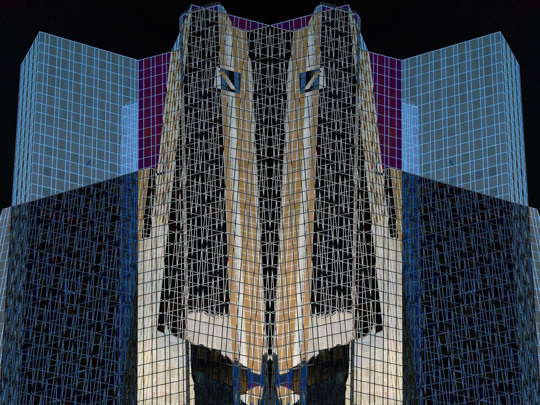Ein Foto der Glasfassaden des bekannten Bürogebäudes der Deutschen Bank in Frankfurt am Main. Das Bild wurde mit einer entlang der vertikalen gespiegelten Version des Bildes mit Hilfe eines speziellen Verfahrens gemischt. Das Ergebnis zeigt eine stilisierte Figur im Anzug deren Augen auf dem Zeichen der Deutschen Bank, einem Schrägstrich) bestehen. Nicht sehr subtil aber einprägsam.