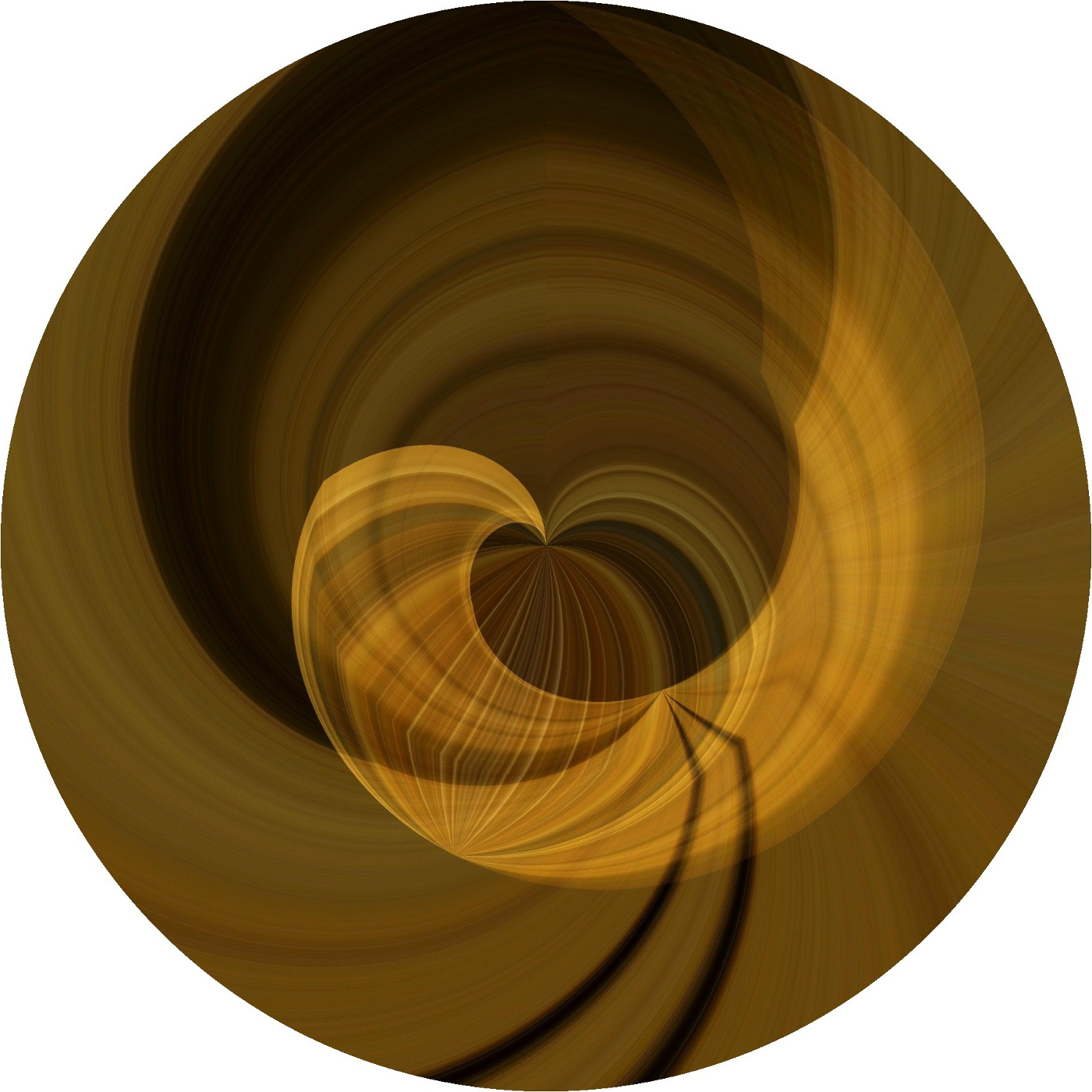 Das Ausgangsbild ist eine Spiegelung in einem Fahnenständer aus Messing. Von diesem Bild habe ich mit verschiedenen Filtern drei Variationen erzeugt, diese dann gemischt und anschließend auf einen Kreis projiziert. Das Bild hat einen starken Drang zum Mittelpunkt, wirkt aber durch zwei fast schwarze Linien im unteren Bereich nicht zu harmonisch. Diese Linien sind die einzige verbleibende Ähnlichkeit mit dem Ausgangsbild, nämlich die Beine des Fotografen.