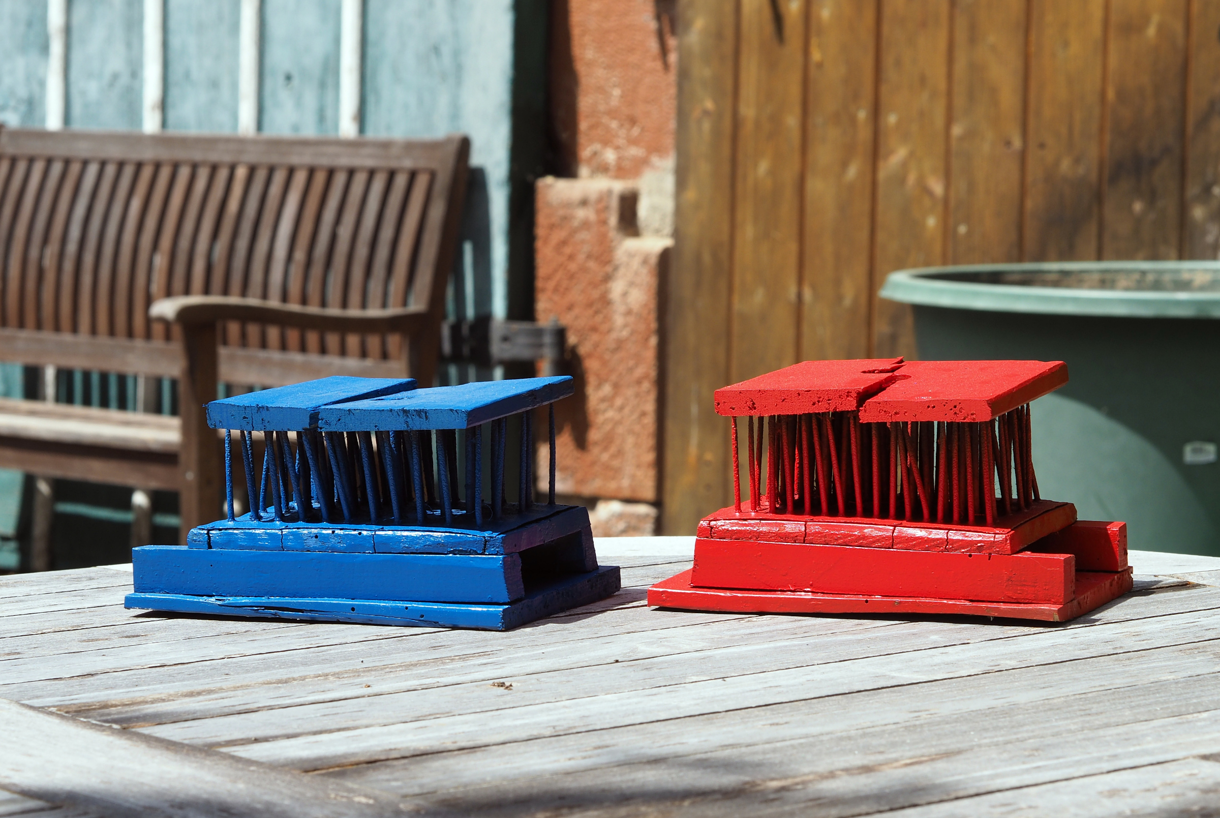 Diese Objekte bestehen aus Teilen eines gefundenen eigenartigen Werkzeugs. Eigentlich ein Brett, durch das Nägel in geringem Abstand getrieben wurden. An der Rückseite war noch eine Holzkonstruktion aufgebracht, an der man einen Stiel befestigen konnte. Also eine Art Gartenwerkzeug oder eine sehr raue Drahtbürste. Das verrostete Teil wollte ich eigentlich wegwerfen. Vorher habe ich es in Einzelteile geschnitten. Damit sich niemand verletzt, habe ich jeweils ein flaches Einzelteil aus Holz von oben mit einem dicken Hammer in die Nagelfelder geschlagen. Als ich die Teile dann vor mir sah, fand ich, dass sie wie Teile aus einer alten Tempelanlage aussahen. Daraufhin habe ich sie gesäubert und mit Sprühlack in zwei verschiedenen Farben eingefärbt. Es sind jetzt Säulenhallen mit Lichteinfall von den Seiten und durch ein Loch von oben. Eine schöne Um-Definition eines ehemals gefährlichen Werkzeugs in Kultstätten (hoffentlich) friedlicher Wesen.