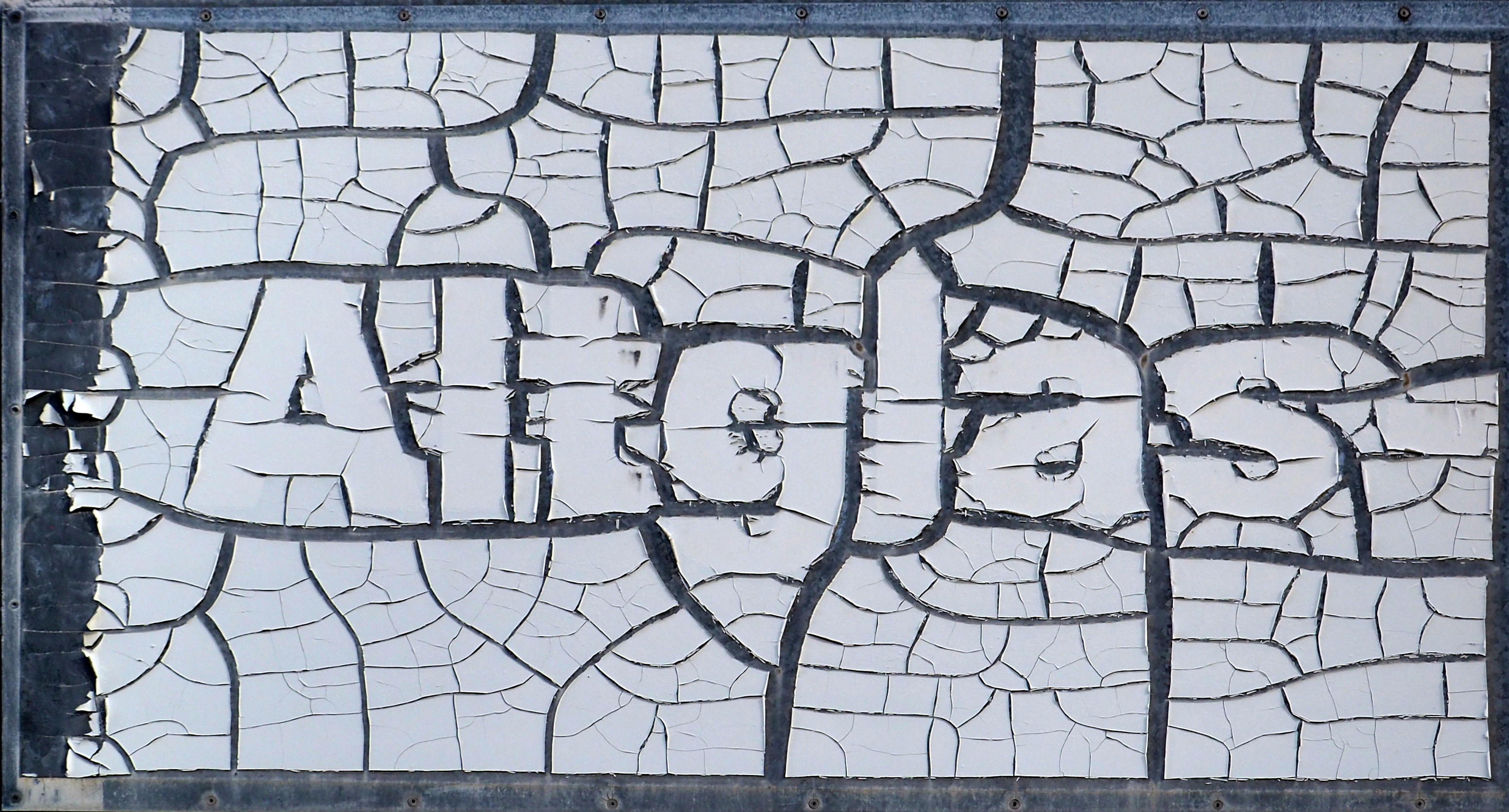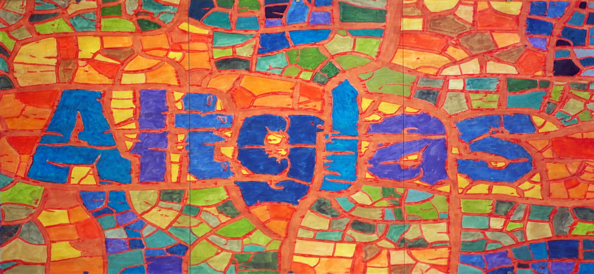 Dieses Bild erinnert an Tiffany-Glasarbeiten oder Kirchenfenster. Im Mittelpunkt steht das Wort „Altglas“ und aus Altglas könnte man in der Tat so etwas herstellen. Tatsächlich handelt es sich aber um eins meiner Fotos, welches ein Schild an der Altglas Sammelstelle auf einem verlassenen Firmengelände (s.u.) zeigt. Die Buchstaben sind auf eine Plastikfolie gedruckt und diese Folie hat im Laufe der Zeit Risse bekommen und die so entstandenen Flächen haben sich zusammengezogen. Einen Ausschnitt des Fotos habe ich dann in schwarz/weiß umgewandelt und in eine Vektorgrafik umgewandelt. Diese hat dann wieder Scribit mit rotem Stift gezeichnet und dann habe ich die Flächen mit Filzstiften ausgemalt.