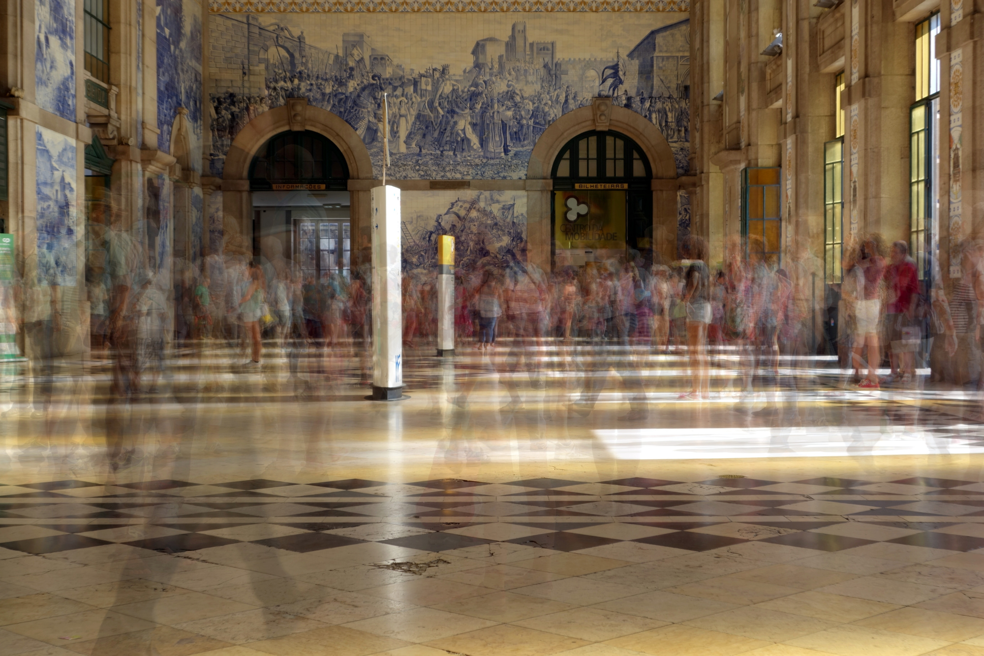 Auf einer Reise in 2016 habe ich im Bahnhof von Porto eine Serie von Fotos mit fest stehender Kamera gemacht. Die Fotos zeigen Menschen, die durch die mit blauen Kacheln verkleidete Bahnhofshalle gehen oder dort stehen. Die Fotos sind in Abständen von 10-15 Sekunden gemacht, wodurch sie sehr unterschiedlichen Menschenmengen erfassen. Die Idee war, diese Bilder zu überlagern, so dass man nur noch die die Halle scharf sieht, der Rest ist verschwommen. Das Ergebnis ist durchaus gelungen aber für mein Empfinden nicht kunstvoll genug.