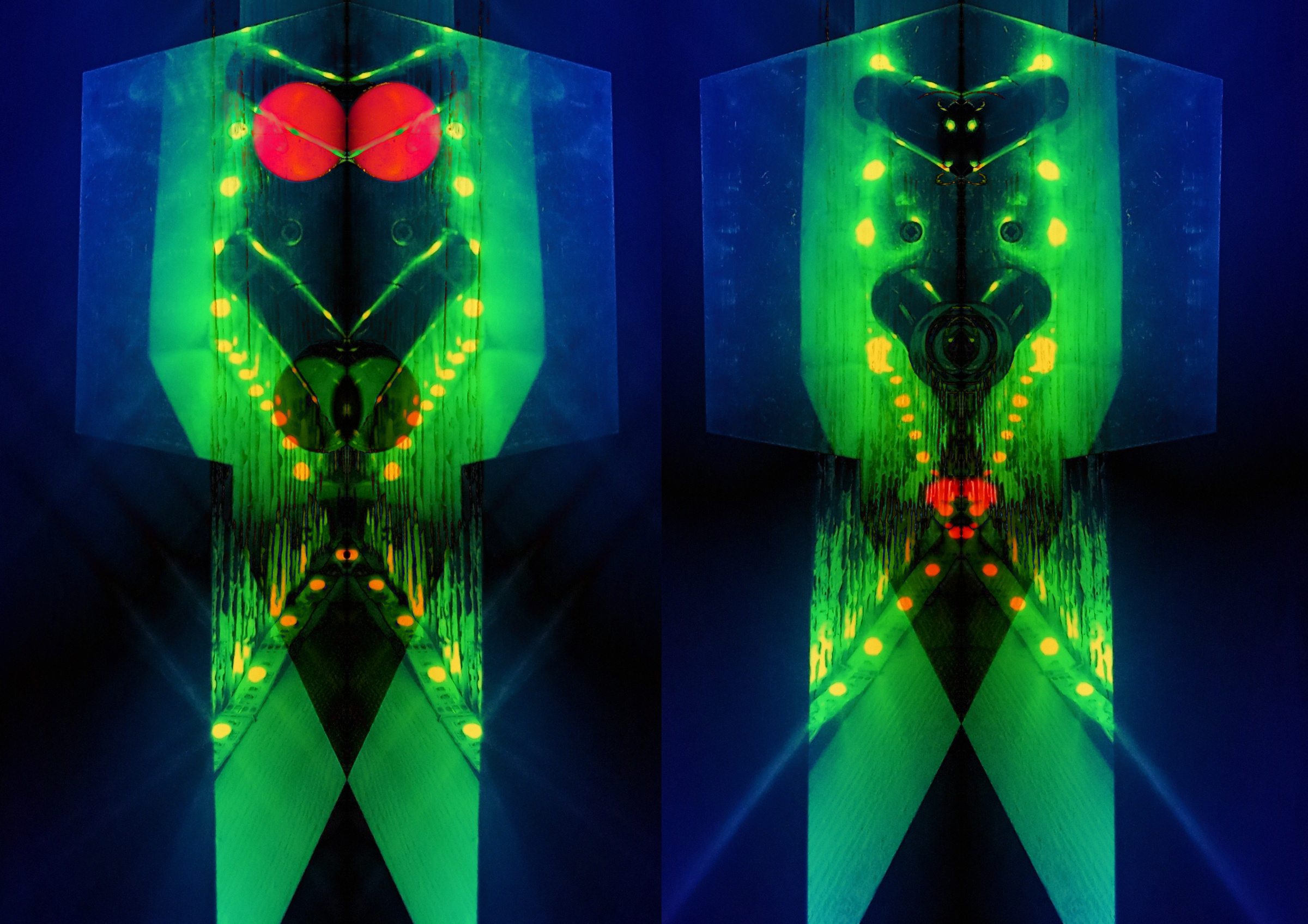Dieses Bild entstand aus einem Foto meiner Skulptur „Politbarometer“. Es zeigt die Skulptur von schräg oben und ist ein Panoramaformat. Aus diesem Bild habe ich mit einem meiner Filter zwei verschiedene „Figuren“ erzeugt. Sie ähneln menschenähnlichen Statuen. In beiden Figuren kann man weibliche und männliche Geschlechtsmerkmale feststellen. Als ich beide Figuren zu einem Bild zusammengefügt habe, fiel mir ein Lied von Peter Gabriel ein. Im Refrain heißt es: