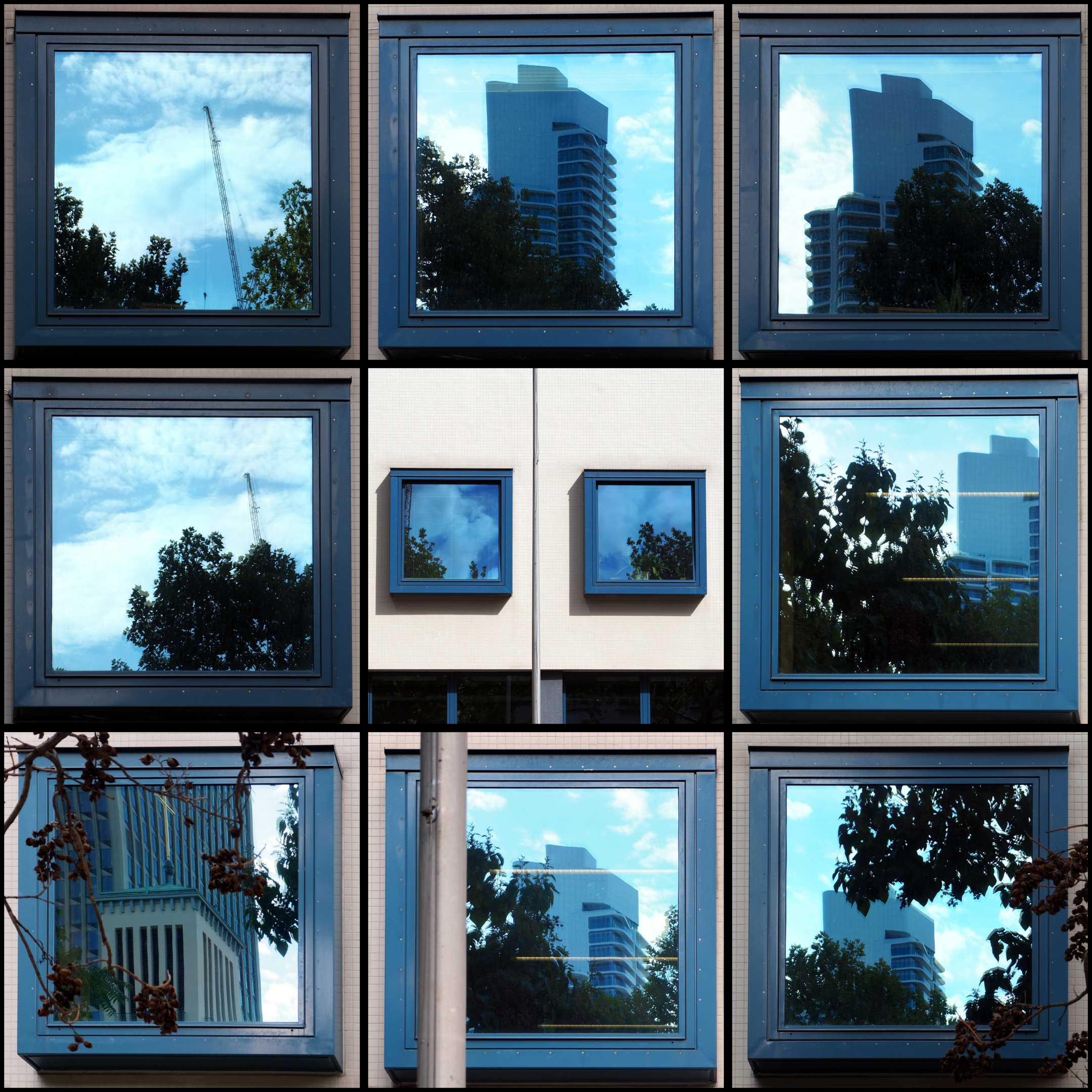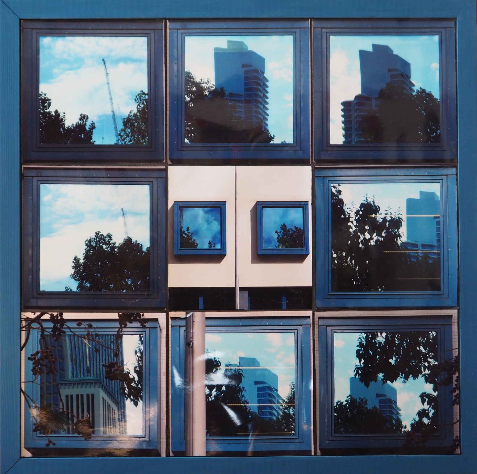 Dieses Bild ist eine Collage von neun Fotos, die insgesamt 10 Mal ein Fenster des Goethe Gymnasium in Frankfurt am Main zeigt. Die Fenster haben einen blauen Metallrahmen und in ihnen spiegeln sich verschiedene Objekte. Ein Baukran, Bäume, ein Hochhaus, die Matthäuskirche. Die äußeren 8 Bilder zeigen jeweils ein einziges Fenster, das mittlere Bild zeigt zwei Fenster. In der unteren Reihe ragen Objekte (Zweige, Blätter, ein Fahnenmast) ins Bild. Das Gesamtwerk besteht aus einem selbst gebauten, blau gestrichenen quadratischen Holzrahmen von 90×90 cm, Die Bilder haben eine Größe von 27x27cm und sind direkt auf eine hinter dem Rahmen befestigte Pappe geklebt. Die bis zu einem Zentimeter breiten Zwischenräume zwischen den Bildern sind schwarz. Der Rahmen spiegelt das Motiv der blauen Fenster wieder. Die erste Abbildung zeigt ein Fotos des fertigen Bildes, die zweite Abbildung ist eine digitale Collage.