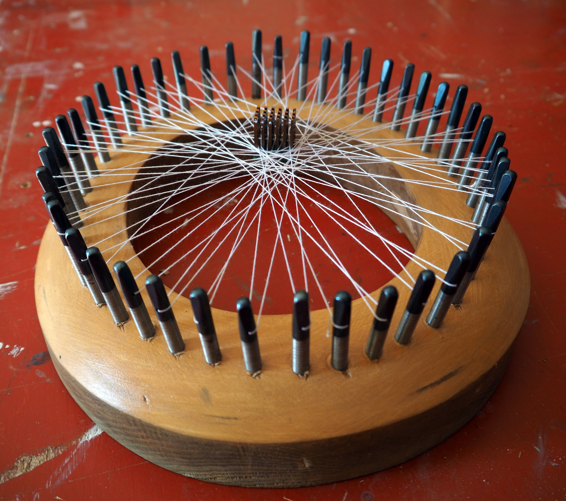 Die Skulptur „Spinne im Netz“ besteht im Wesentlichen erneut aus gefundenen Materialien. Das sind zum einen 45 Klavier-Stimmstifte, dann ein Holzobjekt in Form des Buchstaben O und ein messingfarbener Kühlkörper aus einer Computerplatine. Dazu noch weißer Zwirn von der Rolle, das einzige neu gekaufte Material. Die Stimmstifte habe ich in annähernd gleichen Abständen in die Oberfläche des Holz-Os eingesetzt und mit dem Faden netzförmig verbunden. Im Netz platziert dann der Kühlkörper wie eine Spinne. Bei den Stimmstiften und dem Holzring handelt es sich um klassische Materialien Holz und schweres Eisen. Beide Materialien sind mit klassischen Werkzeugen bearbeitet. Auch das Garn ist ein traditionelles Material. Der Kühlkörper ist maschinell gefertigt und steht auch für moderne Technik. Der Kühlkörper als Spinne im Netz soll auf die Übernahme der Tradition durch die Computertechnik hinweisen, insbesondere auf die Tech-Konzerne wie Google oder Meta, die uns ja auch gerne „einwickeln“.
