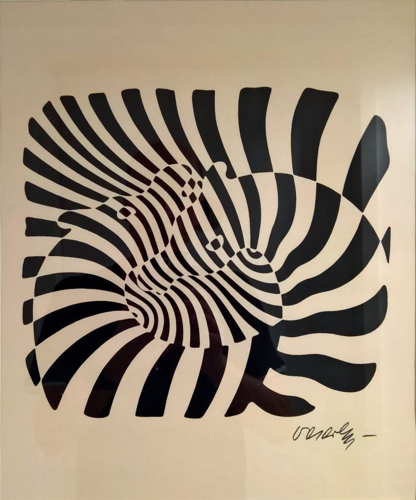 Bei einem Besuche der Fondation Vasarely in Aix-en-Provence sah ich auch seine berühmten „Zebras“. Im Bestand des Kunstvereins Marburg fand ich zufällig einen Druck des Motivs, eine Version in schwarz auf beige. Diesen habe ich fotografiert und die Fotografie mit einer Software in eine schwarze Vector-Grafik umgewandelt. Diese habe ich mit dem Zeichenroboter Scribit auf Posterpapier in ca 45×40 cm zeichnen lassen, dann die schwarzen Flächen mit einem Cutter ausgeschnitten und so eine Sprühschablone erstellt. Mit der Schablone habe ich die Zebras in rot, blau, schwarz und weiß auf eine Pappe gesprüht und anschließend den weißen Anteil mit Acrylfarbe übermalt. Die hierbei häufig vorgekommenen Übermalungen der Farbflächen habe ich nachträglich mit deckenden Filzstiften übermalt. Dadurch sehen die einzelnen Bilder im Gegensatz zum Original ziemlich verschwommen aus, was jedoch beabsichtigt ist. Das Gesamtwerk ist nun ein Motiv von Victor Vasarely, im Stil von Andy Warhol, interpretiert und erstellt von mir.