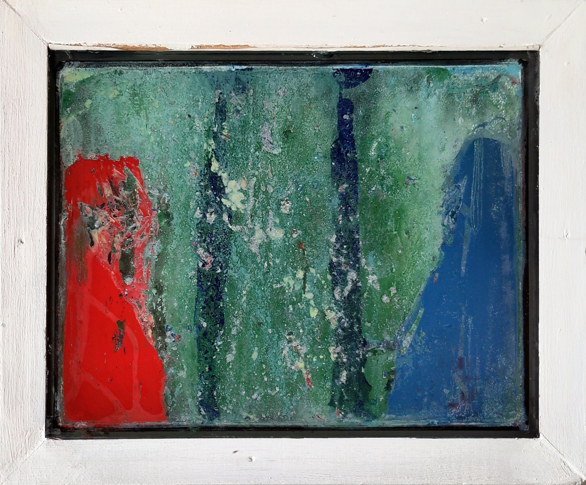 Mein sechstes Bild der Serie „Flüssigglas“. Zur Technik siehe hier. Dieses Bild habe ich mit Spraydosen hergestellt, indem ich durch die Öffnungen oben im Rahmen Farbe zwischen die Glasscheiben gesprayt habe. Rot und blau relativ konzentriert auf zwei Stellen, das Grün wolkig. In der Mitte wurden noch zwei Streifen dunkleres Blau eingebracht. Dazu noch etwas Gips. Später habe ich wie meistens noch mit einem Draht die Farbflächen aufgekratzt. Wegen der schnell trocknenden Lackfarben gibt es keine „Wasserlinie“. Das Bild steht auf dem Kopf, die Öffnungen sind unten.