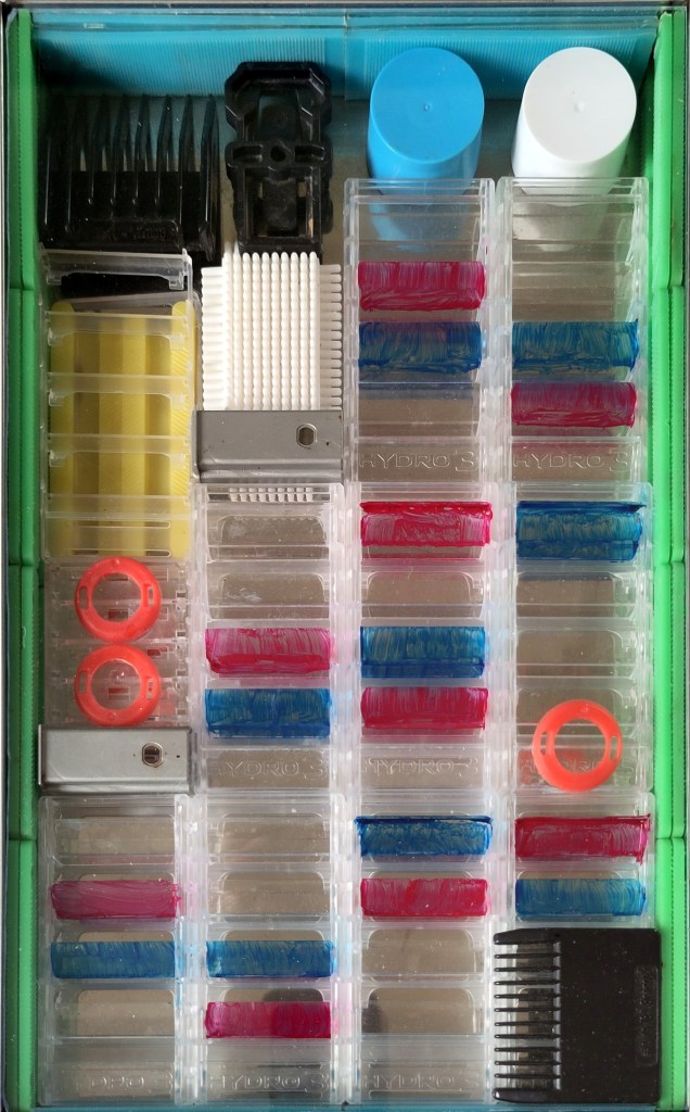 Auch diese Skulptur ist (bis auch den Plexiglasdeckel) 100% Upcycling. Die Materialien sind Tubendeckel, Behälter für Rasierklingen, Aufsätze eines alten Haartrimmers und andere. Die einzelnen Teile sind so angeordnet, dass sie genau in den Edelstahl-Rahmen – ein Teil vom Schrott – passen. Damit das funktioniert kommen grüne und blaue „Abstandhalter“ zum Einsatz, die ich aus Sprossenfenstern ausgebaut habe (genau! die Sprossenfenster, aus denen ich die Glasscheiben für meine „Flüssigglas“ Bilder entnehme). Einige Flächen der Rasierklingen-Behälter habe ich nach einem lockeren Muster mit leuchtenden Farben bemalt. Ich betrachte das Objekt als ein „Art-House“ mit vielen Stockwerken.