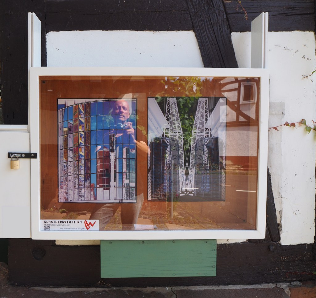 Seit letzter Woche bewerbe ich mein Atelier in Oberwalgern mit einem selbst gebauten Schaukasten. Dort findet man immer wieder wechselnde Beispiele meiner Kunst sowie einen QR Code mit einem Verweis auf meine Webseite. Das Haus liegt direkt am Lahnwanderweg und vorbei kommende Wandersleute sind auch eingeladen einzutreten und zu schauen, was der Künstler so alles ausstellt. Im Moment hängen zwei Exemplare meiner Serie „Architektur Frankfurt“ im Schaukasten.