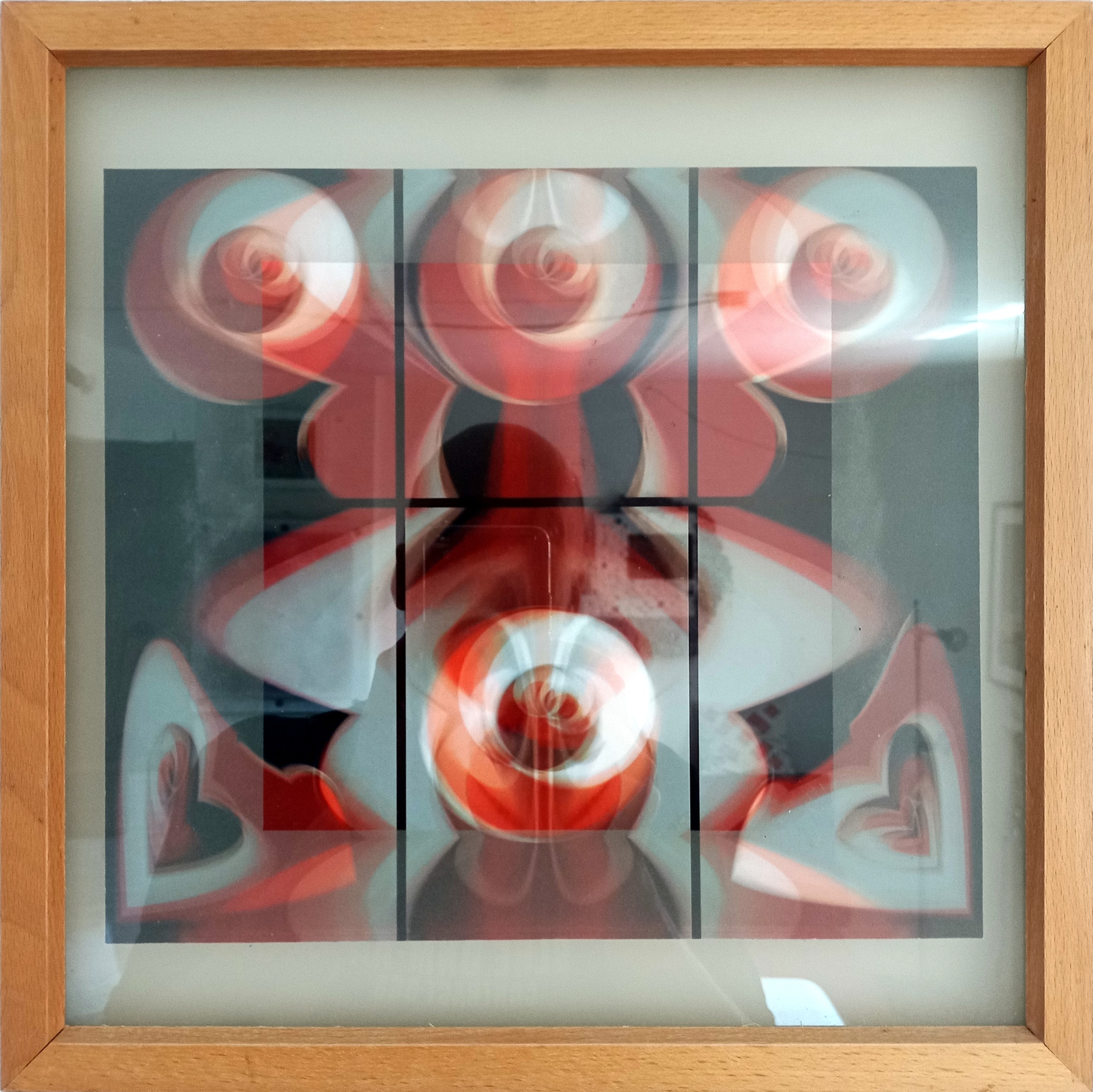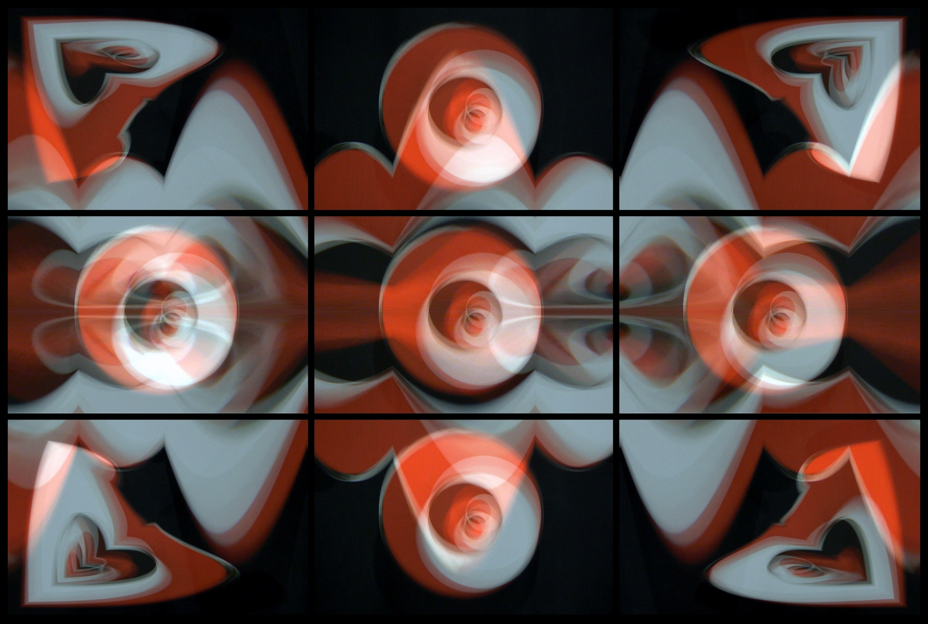 Bei einem Museumsbesuch in Metz habe ich eins der sogenannten Rotoreliefs von Marcel Duchamp fotografiert. Das ist eine rotierende Scheibe mit einem geometrischen Muster. Mit längerer Belichtung ergibt sich ein Bild, dem man die Rotation ansieht. Aus dem Bild habe ich 9 Versionen mit Hilfe eigener Filter erstellt und daraus eine 3×3 Collage mit Gitterlinien im 3:2 Format zusammengestellt. Hier die finale Version.